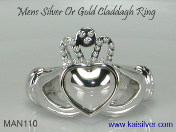 It is now obvious that a claddagh ring whether, meant for a lady or man would have the same essential features. However fine jewelry providers have, developed fine claddagh rings for men that appear impressive and not feminine. Kaisilver's claddagh rings for men have large dimensions and the heart in the center is around, 8 to 9mm. Substantial metal weight (gold or 925 silver) is invested in the jewel - this ensures that the ring is sturdy and long lasting. Basically anyone who sees this gold or silver claddagh men's ring, would mistake it for a lady's jewel. And just keep in mind that, the choice of metal or gemstone for your men's heart ring will not have any bearing on the level of, meaning and significance the the jewel has.