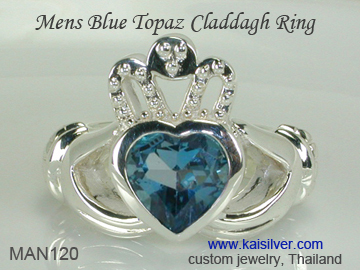 You could order a gold or 925 silver claddagh men's ring with a gemstone, and the gem can be selected by you. Given the large size of the gem (8-9mm), it is very likely that few gems would go beyond many budgets. For example, medium to good quality blue sapphire, ruby, emerald and even tanzanite can get quite expensive in those sizes. The most popular gems for mens claddagh rings are as follows, deep red garnet, black onyx, deep brown agate, citrine, dark blue topaz, darker shades of amethyst, stabilized turquoise, dark green jade, blue lapis, smoky quartz and champagne quartz. These gems are priced moderately and it is not very difficult to find them in larger sizes. The next tier of gems which are a bit stiff on price points are peridot, aquamarine, green tourmaline, morganite, iolite, white opal, fire opal etc. And after this come the big three, emerald, ruby and sapphire. Before you choose a specific gem for your men's cladagh ring, discuss the issue with your jeweler. It is not uncommon for jewelry buyers to be unaware of some basic information related to gems. Many people still thing that, the only natural green gem is emerald and that, all naturally found red gemstones are ruby and all blue gems are sapphires. An interesting thing is that, a 9mm blue sapphire gem can cost as much as 3,000 U.S$ to 5,000 U.S$ even for a medium grade stone. On the other hand, you could get a yellow sapphire gem with good clarity, color and cut in a 9mm heart size, for around half of what a medium grade blue sapphire would cost you. These are issues which are best discussed with your jeweler, so choose a jeweler who is willing to inform and guide you. The MAN120 Gemstone Mens Claddagh Ring, is shown here with a dark blue or London Blue Topaz gemstone.